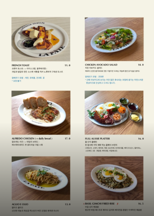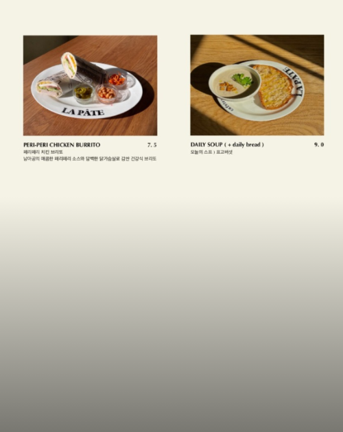 라파테에서는 다양한 브런치 메뉴와 베이커리, 음료, 디저트를 제공하고 있는데, 모든 빵은 첨가물이 없는 건강한 재료를 사용하여 매장에서 직접 굽는 천연 발효종 빵입니다.