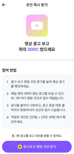 5. '코인 즉시 받기' 메뉴 (광고 3회 보고 적립)