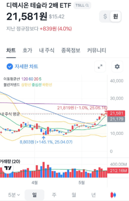 테슬라의 주가 방향성을 2배 추종하는 고위험·고수익 ETF로, 최근에는 많이 하락했지만 단기 매매용으로 보유하는 종목입니다.