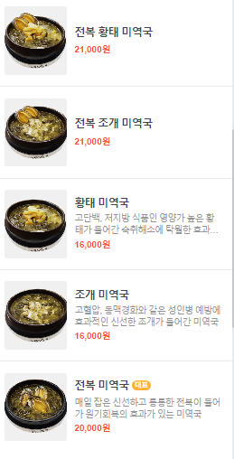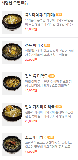 이 외에도 얼큰 소고기 미역국, 전복 소고기 미역국, 전복 가자미 미역국, 전복 황태 미역국 등 다양한 메뉴가 있기 때문에 본인의 기호에 맞는 음식을 주문하시면 됩니다.