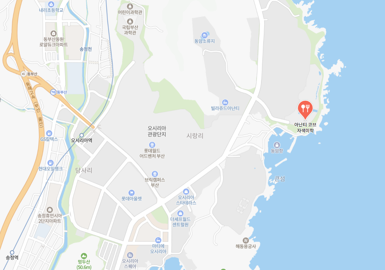이곳의 주소는 부산광역시 기장군 기장읍 기장해안로 268-32이며, 제가 자주 방문하는 롯데월드어드벤처 부산이 있는 오시리아관광단지에서 차로 대략 5분 정도밖에 걸리지 않아 접근성이 아주 좋습니다.