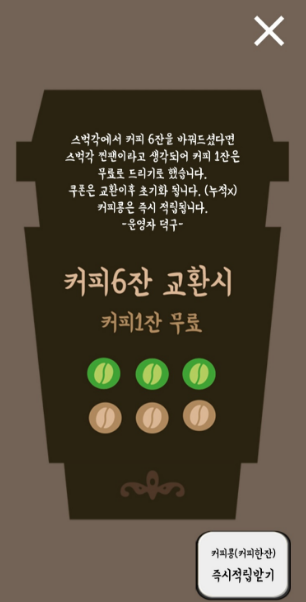커피콩을 매일 꾸준히 모으다 보면 커피 6잔은 금방 교환하실 수 있기 때문에 쿠폰북의 무료 혜택을 꼭 활용하시기 바랍니다.