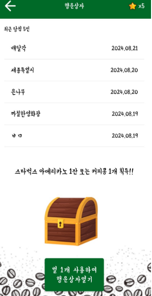 이 5개의 방을 각각 클릭해서 당첨될 경우 커피콩을 획득할 수 있는 메뉴입니다.