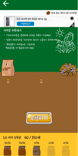 이 아이콘을 눌러서 들어가면 화면 아래쪽 중간에 '수확하기' 버튼이 있는데, 버튼을 계속 누르면 커피를 배달해 주는 사람이 왼쪽 끝까지 이동하는 것을 알 수 있습니다.