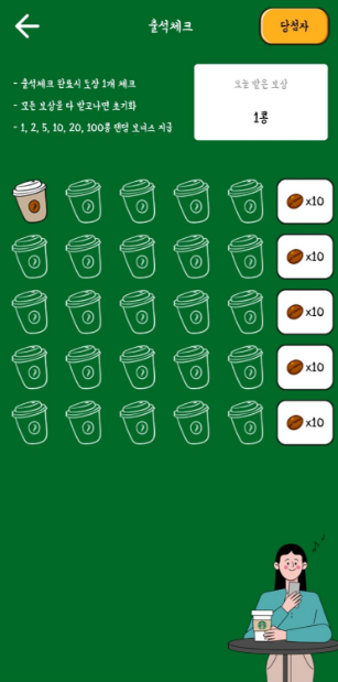 메인화면 왼쪽 아랫부분에 위치한 '출석체크' 버튼을 클릭하여 커피 그림을 누르면, 매일 1콩씩 얻을 수 있습니다.
