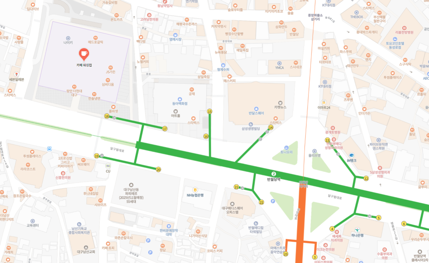 카페 '워킹컵'은 대구시 중구 달구벌대로 2077(더현대 대구점) 9층에 위치하고 있으며, 9층 전체가 모두 카페 워킹컵이 운영 중에 있습니다.