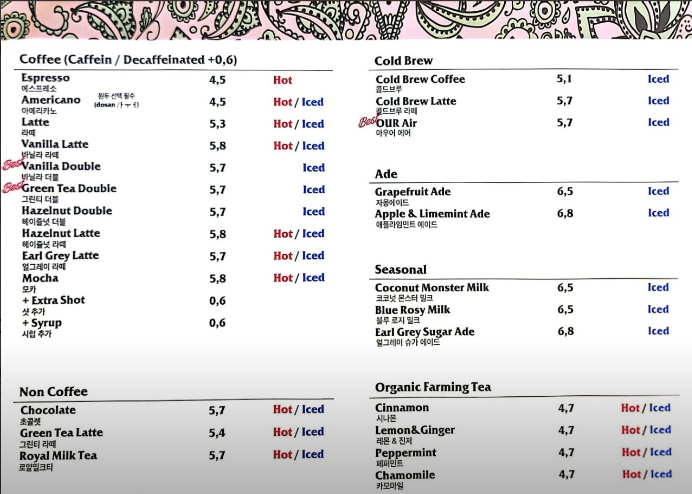 위 메뉴판을 보면 커피를 비롯한 음료의 종류가 아주 다양하고, 가격대도 적당하게 형성되어 있습니다.