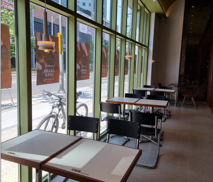 보시다시피 카페 내부는 깔끔하게 인테리어 되어 있으며, 오가면서 편하게 잠시 머무를 수 있도록 예쁜 조명과 화분을 배치해 놓았습니다.