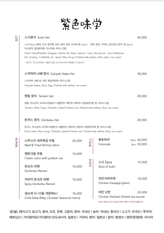 이 외에도 '자색미학'에는 신선한 회로 만드는 스시 정식을 비롯해 텐동 정식, 스키야끼 나베 정식, 우동, 라멘 등 다양하면서도 맛있는 메뉴들을 제공하고 있습니다.